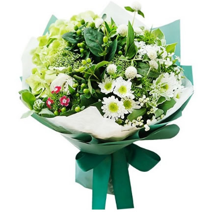 商品簡介:進口繡球1只、綠色桔梗5支,白色桔梗5支,石竹梅綠葉豐滿