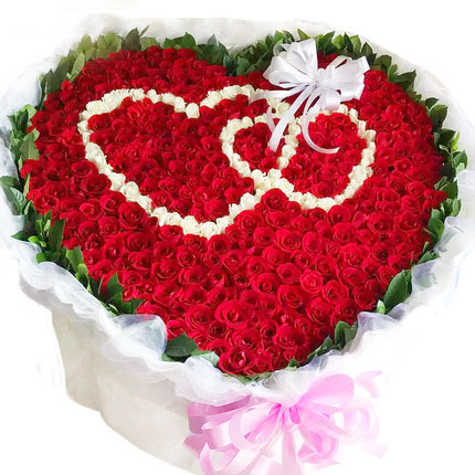 商品簡(jiǎn)介:紅玫瑰,白玫瑰999支,白玫瑰擺心心相依造型,綠葉搭配,白色包裝紙包裝,白色紗網(wǎng)外圍,粉色絲帶扎束