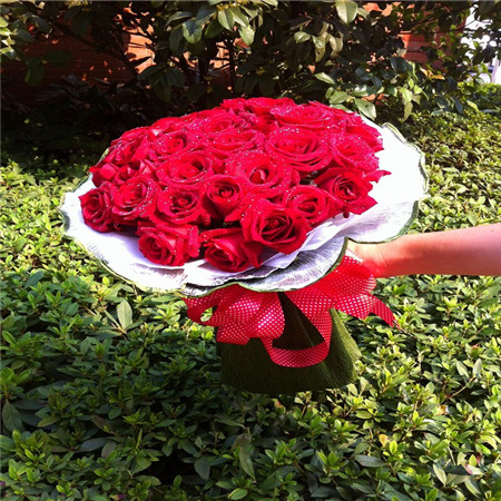 商品簡介:33枝A級紅玫瑰 商品包裝深色皺紋紙包圓形 ,紅色蝴蝶結扎束