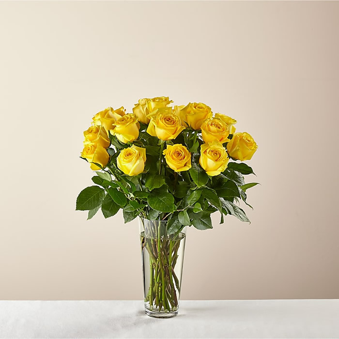 材料包裝: 18朵長莖黃玫瑰,瓶插花。