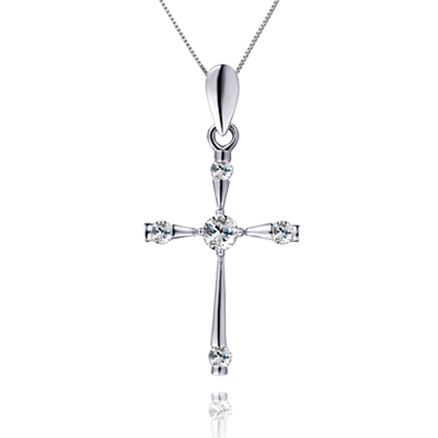 商品簡介:白金十字架吊墜,由中央的一顆華美主鉆向四方延伸出十字的主體,十字末端更精細鑲嵌了四顆璀璨小鉆,顯得高貴莊嚴而又別具一格。