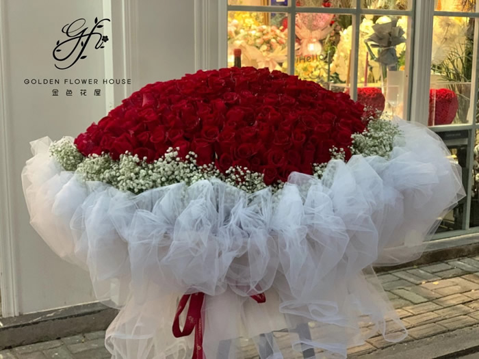 商品簡(jiǎn)介:999朵紅玫瑰,滿天星圍,白色網(wǎng)紗高檔包裝。
