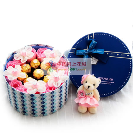 材料包裝: 產品包含:15朵香皂花,9顆費列羅巧克力,一只婚禮熊。 禮盒尺寸:直徑20*高12CM