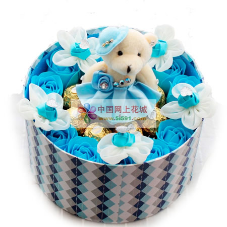 商品簡介:產品包含:15朵香皂花,9顆費列羅巧克力,一只婚禮熊。 禮盒尺寸:直徑20*高12CM