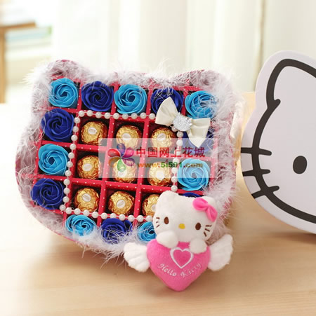 材料包裝: 產品包含:14朵香皂花,9顆費列羅巧克力,一只天使KT貓公仔 禮盒尺寸:長22*27CM