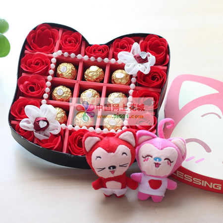 材料包裝: 產品包含:16朵香皂花,9顆費列羅巧克力,一只天使KT貓公仔 禮盒尺寸:長23CM*寬23CM