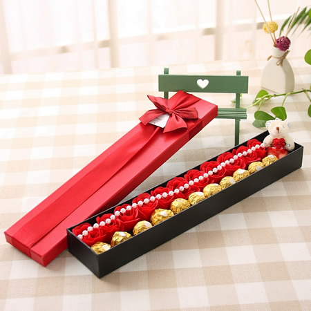 材料包裝: 產品包含:11朵香皂花,11顆費列羅巧克力 禮盒尺寸:長44*寬8.5*高4.5CM
