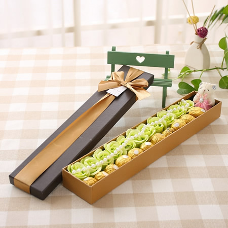材料包裝: 產(chǎn)品包含:11朵香皂花,11顆費列羅巧克力 禮盒尺寸:長44*寬8.5*高4.5CM