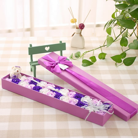材料包裝: 產品介紹:25朵香皂花+小熊 顏色:深紫+淺紫+白 長44*寬8.5*高4.5CM