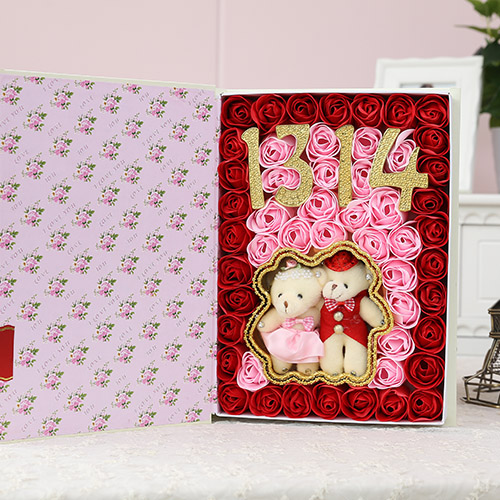 商品簡介:香皂花:51朵書本1314+抱熊 紅色禮盒