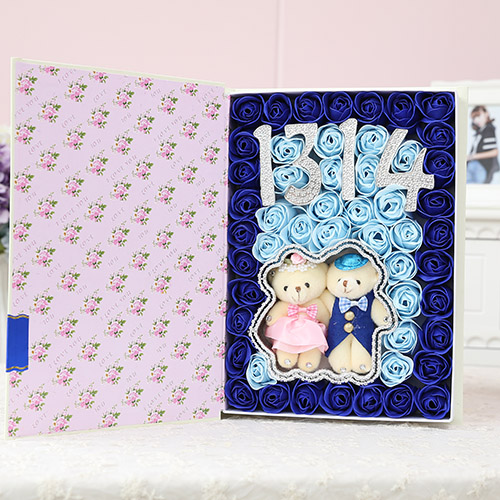 商品簡(jiǎn)介:香皂花:51朵書本1314+抱熊 藍(lán)色禮盒