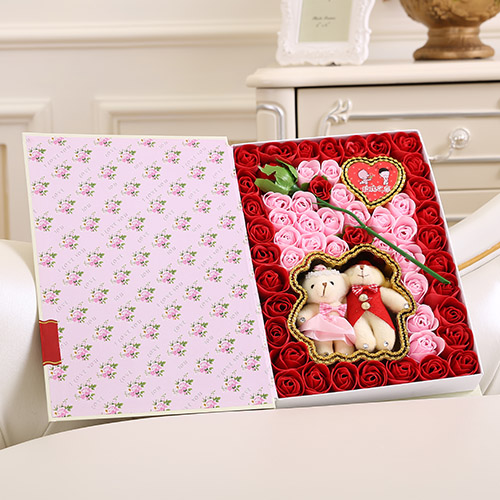 商品簡介:香皂花:51朵書本一枝花+抱熊 紅色禮盒