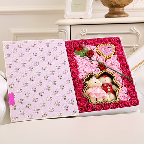 商品簡介:香皂花:51朵書本一枝花+抱熊 玫紅色禮盒