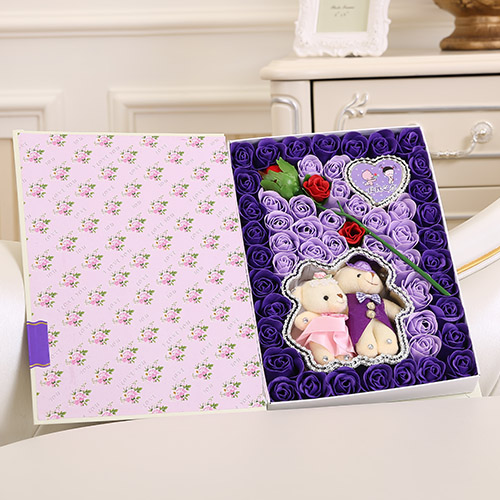 商品簡介:香皂花:51朵書本一枝花+抱熊 紫色禮盒