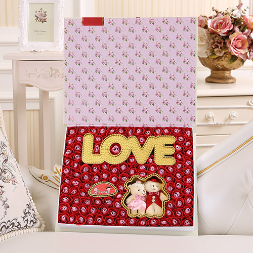 商品簡介:香皂花:99朵書本橫版LOVE+抱熊 紅色禮盒