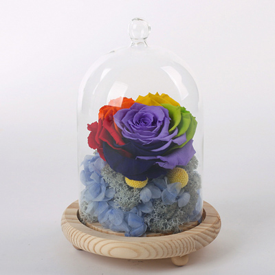 材料包裝: 主材:1朵彩虹玫瑰,配材:藍色繡球花,尺寸:玻璃罩,直徑14CM,高20CM