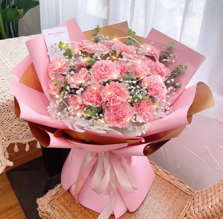 商品簡介:19朵粉色康乃馨,燈帶一條,滿天星,尤加利葉,粉色高檔包裝紙。