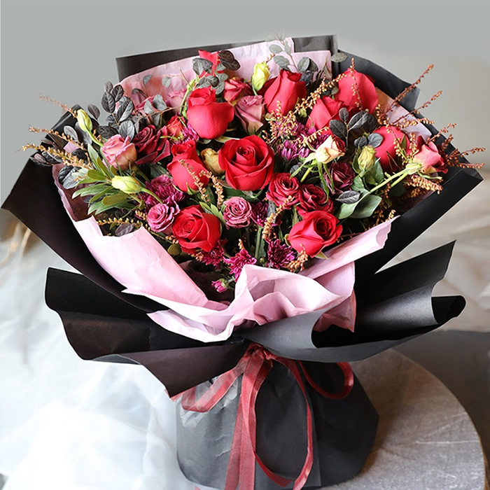 材料包裝: 材料9朵紅玫瑰,搭配適量紅色洋桔梗、紫色小雛菊、多頭紫羅蘭玫瑰、山里紅、紫葉里裝飾。包裝粉色軟紙+黑色硬紙韓式扇形包裝,精美紅色絲帶蝴蝶結束扎。