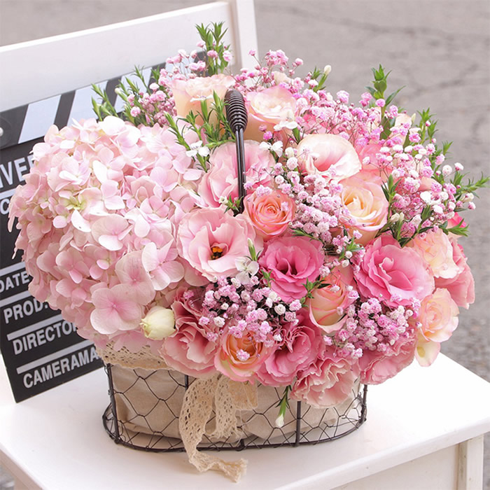 材料包裝: 粉色滿天星點(diǎn)綴,2只粉繡球花,11朵粉玫瑰,11只粉桔梗,手提竹籃(或鐵籃)