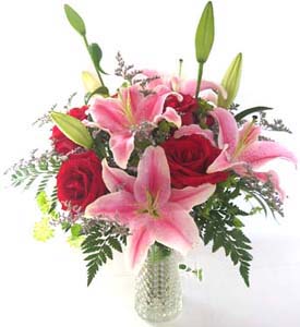 材料包裝: 【花 材】3枝多頭粉百合,5枝紅玫瑰,點(diǎn)綴情人草葉材作成精美的花瓶花插,精美玻璃花瓶一個(gè)