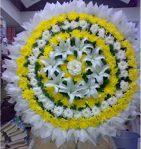 材料包裝: 白菊花黃菊花白百合組合花圈