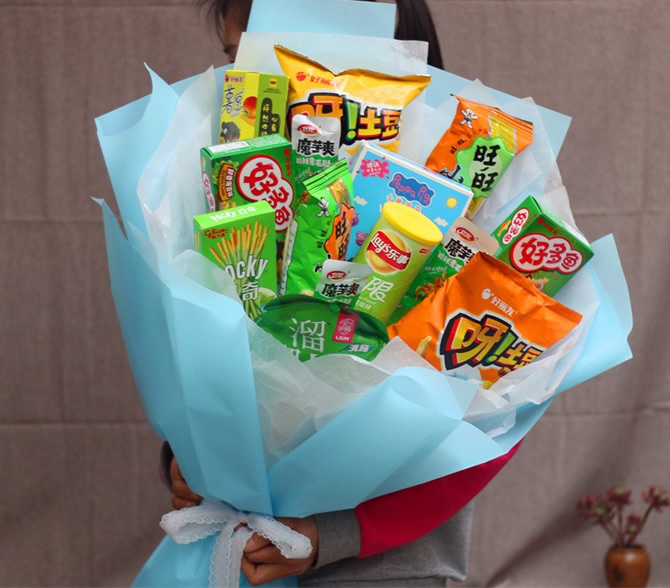 材料包裝: 材料:土豆2袋、衛龍魔芋爽3袋、旺旺小小酥2袋、好多魚2盒、pocky曲奇1盒、薯愿薯條1盒、小豬佩奇棒棒餅干1盒、溜溜梅1袋,包裝:內襯白色雪梨紙,外層藍色韓素紙圓形包裝,白色蕾絲帶束扎
