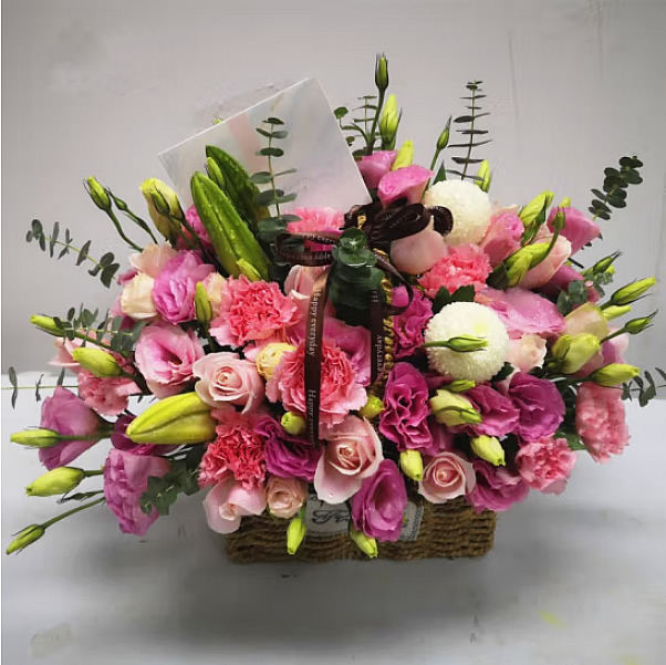 商品簡介:19朵粉色玫瑰,11朵康花,2支多頭百合花,40朵白桔梗,15朵紫桔梗,2朵乒乓菊(可以用3朵白玫瑰代換),綠葉點綴,手提花籃