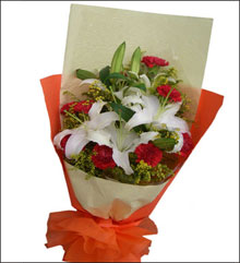 商品簡介:[名 稱] 鮮花·百合·心之祝福 [材 料] 2支多頭白色香水百合,9支紅色康乃馨,加拿大黃鶯搭配
