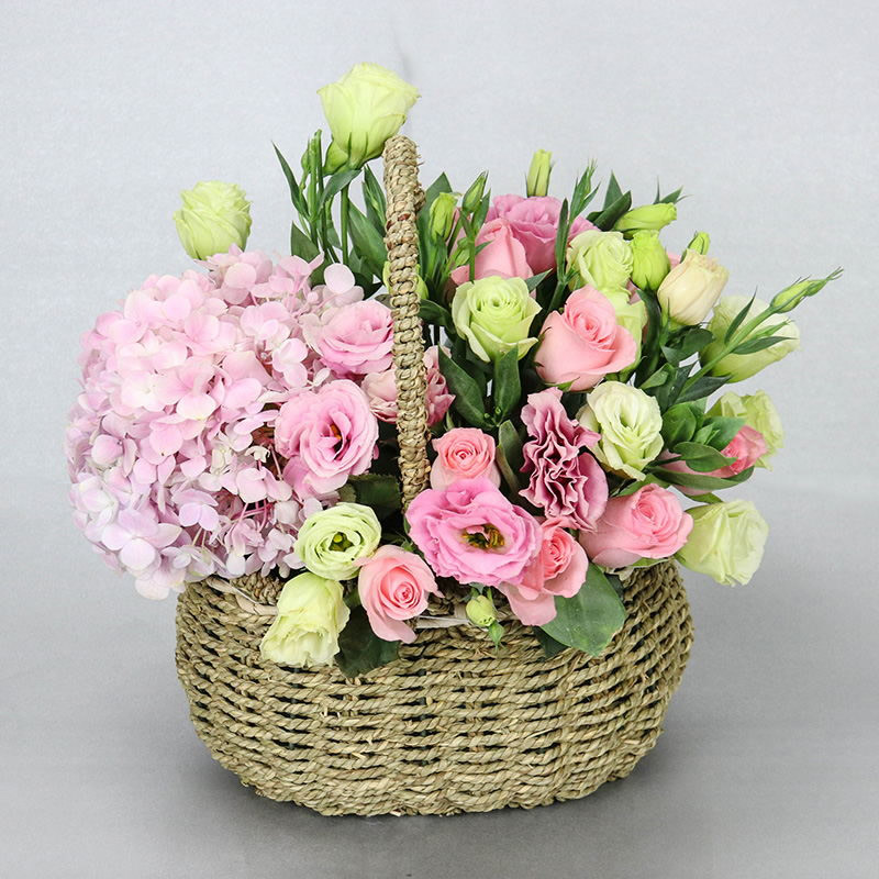 商品簡介:19朵粉玫瑰,19朵白洋桔梗,粉繡球1只,綠葉點綴,竹籃一個.