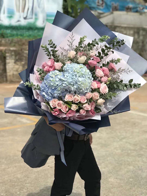 材料包裝: 花材:2朵淡藍色色繡球花11朵白玫瑰11朵戴安娜11朵淡粉色玫瑰,情人草滿天星尤加利等配花搭配包裝 熊抱花束長度不低于1米