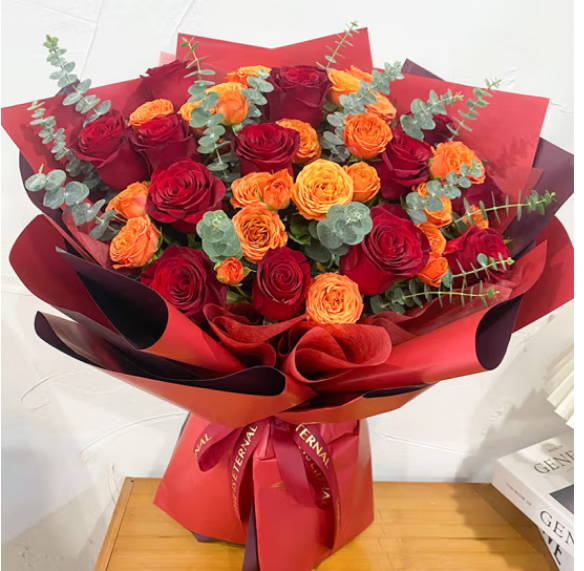 材料包裝: 紅玫瑰14枝,香檳玫瑰5支,橙色多頭泡泡3枝(6頭以上/枝)配草2枝尤加利葉若干