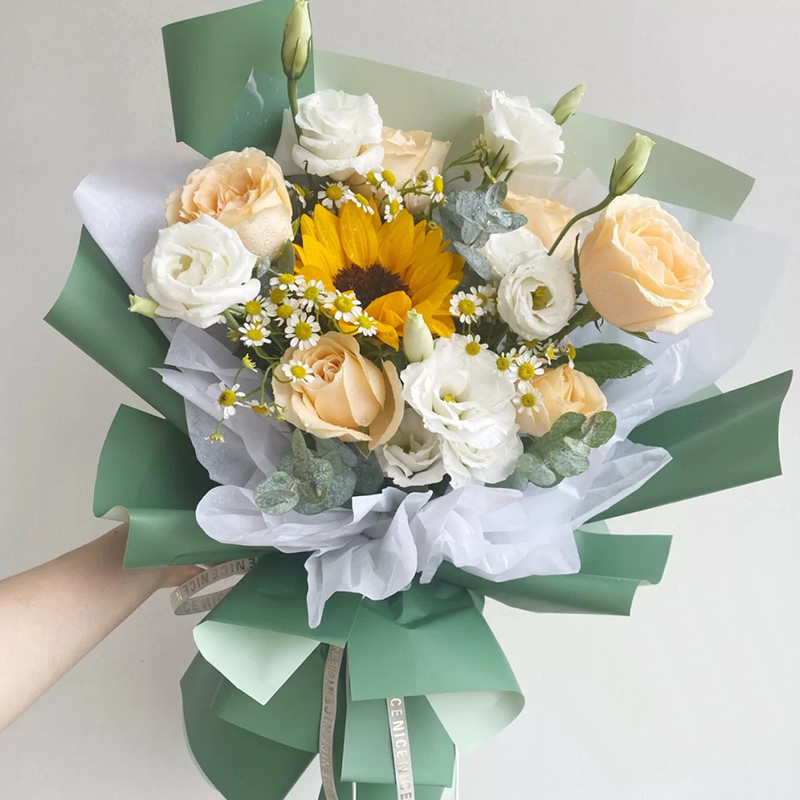 商品簡介:5只香檳玫瑰,7只洋桔梗,1只向日葵,綠葉點綴,紅色小雛菊,燈帶一條,墨綠色包裝.