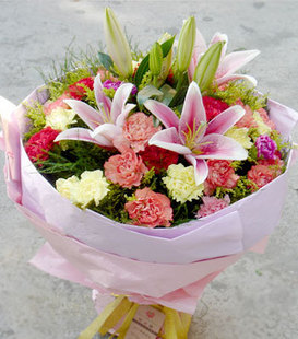材料包裝: 【花材包裝】:2枝粉香水百合,19枝多色康乃馨,綠草點綴,粉色皺紋紙外圍,圓形包裝。