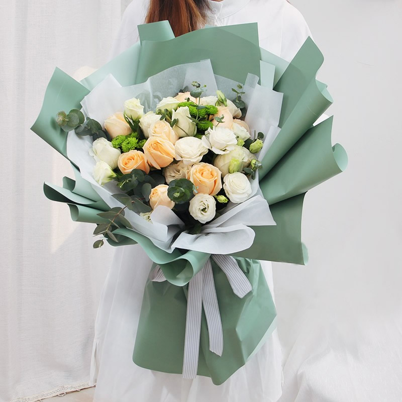 材料包裝: 11朵香檳玫瑰,白色桔梗(不少于12朵),綠色小雛菊間插豐滿,包裝:內襯白色霧面紙,不少于7張墨綠色牛皮紙,條紋絲帶蝴蝶結束扎