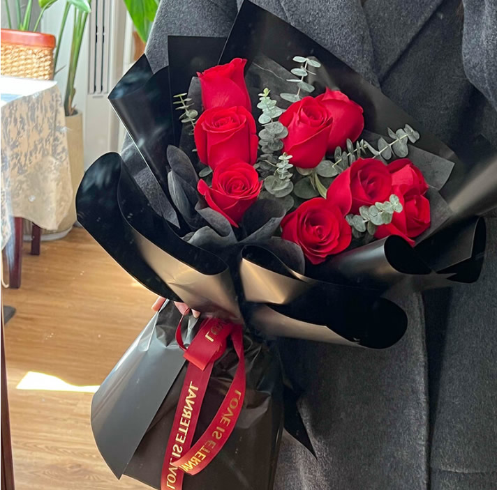 材料包裝: 紅玫瑰9枝,綠葉點綴,黑色雙層包裝。