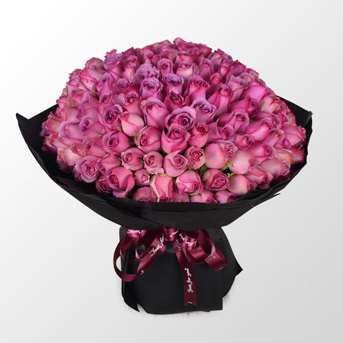 材料包裝: 材料121朵紫玫瑰。包裝黑色卡紙包裝,紫色英文緞帶蝴蝶結(jié)束扎。