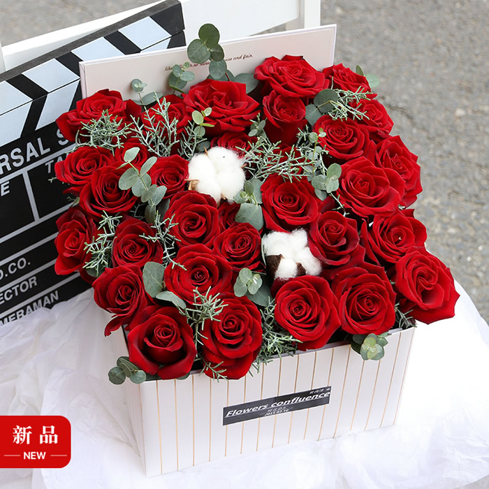 材料包裝: 33朵紅玫瑰禮盒、配材:半扎銀松、8枝尤加利,2支棉花(或白玫瑰)。