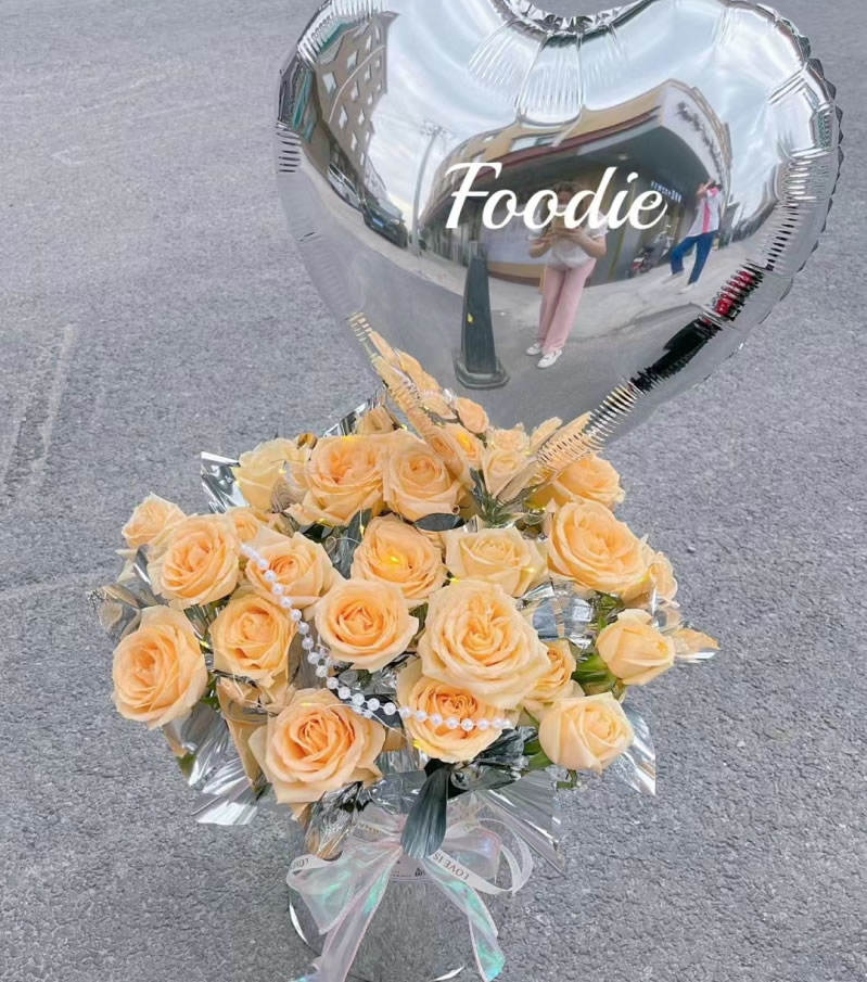 商品簡介:33朵香檳玫瑰,抱抱桶,氣球一個。