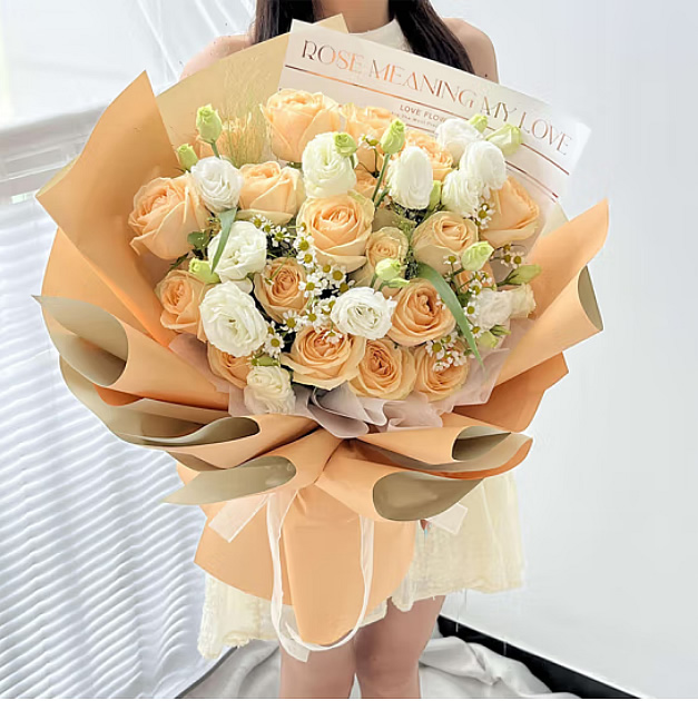 材料包裝: 香檳玫瑰19朵,10朵白桔梗,綠草點綴,高檔3層包裝。