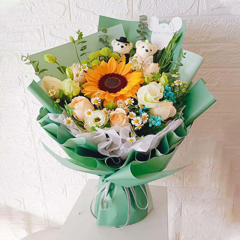 材料包裝: 11朵䊬玫瑰,11朵白桔梗,向日葵一個,2只小熊,小雛菊,小菊花,滿天星點綴,尤加麗葉,內襯白色包裝紙,外轉綠色包裝.