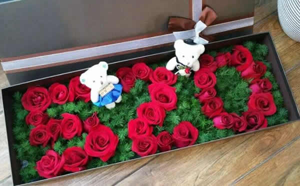 材料包裝: 33只紅玫瑰2只小熊,520造型高檔禮盒花