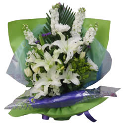 商品簡介:「材  料」 主要花材:百合 「包  裝」 6白百合4支紫羅蘭花束-清明時節
