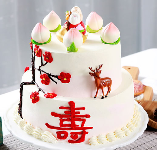 商品簡介:12+8寸雙層祝壽蛋糕,內(nèi)層原味海綿蛋糕胚+乳脂奶油(含水果果肉)疊層,表層壽桃等擺件裝飾。