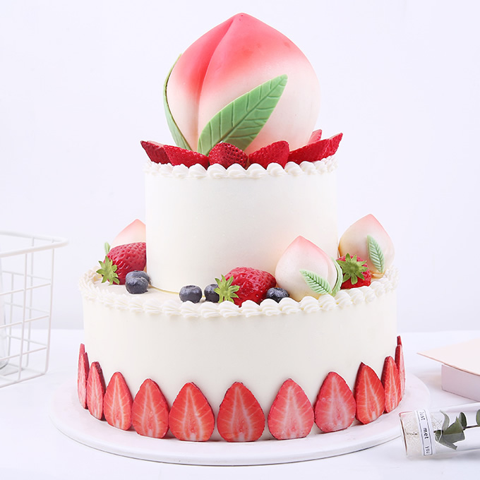 商品簡(jiǎn)介:12寸+8寸雙層水果蛋糕,內(nèi)層原味海綿蛋糕胚+乳脂奶油(含水果果肉)疊層,表層草莓+藍(lán)莓+壽桃裝飾。