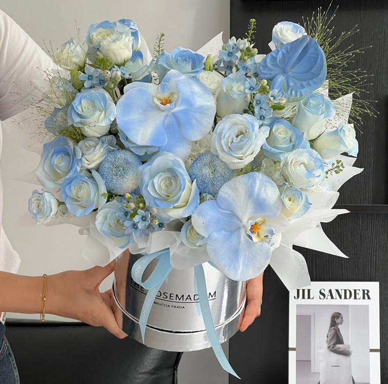商品簡介:19朵碎冰藍,10只白桔梗,2只乒乓菊,2只藍色蝴蝶蘭,1只藍掌,配草大飛燕(或者其它綠葉代換),黃英等綠草間插,抱抱桶,