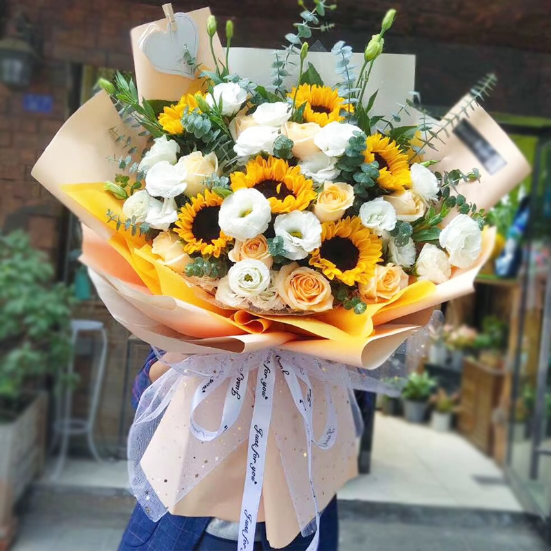 材料包裝: 6朵向日葵混搭香檳玫瑰19朵,19朵白洋桔梗,尤加麗葉,米黃色包裝.