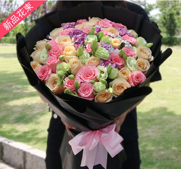商品簡介:材料17朵香檳玫瑰+16朵粉玫瑰+10支白色洋桔梗,其它小配碎花黑色包裝。