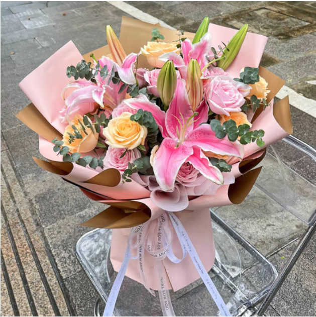 商品簡介:6支粉玫瑰,5支香檳玫瑰,2支多頭百合(不少于3個頭),尤加麗葉,粉色圓形包裝