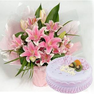 材料包裝: 5支多頭白色香水百合,圓形淡粉色包裝 10寸水果蛋糕