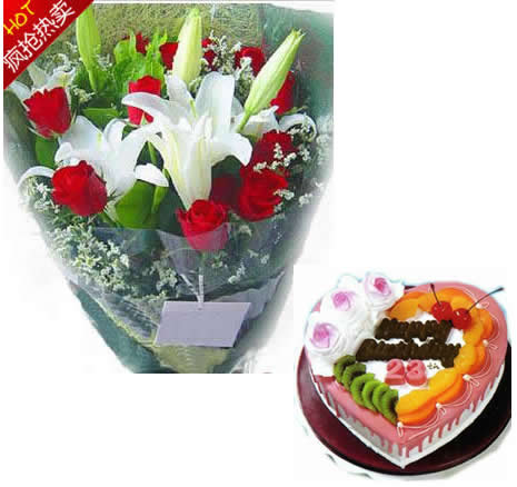 材料包裝: 11枝昆明精品紅色玫瑰,多頭白色香水百合1枝,水晶草豐滿。包 裝: 深綠色棉紙西式包裝,紅色蝴蝶結束扎。 10寸水果蛋糕